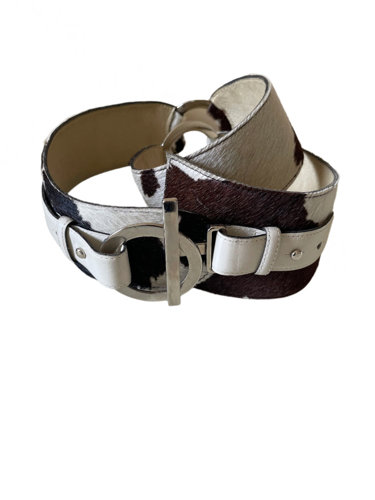 UNBRANDED BROWN & CREAM PONY SKIN SILVER RING & BAR FASTEN BELT