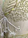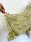 SEMI SHEER SILK ADORNED IN WHITE PEARLS AND GREEN SEQUINS AND BEADS