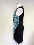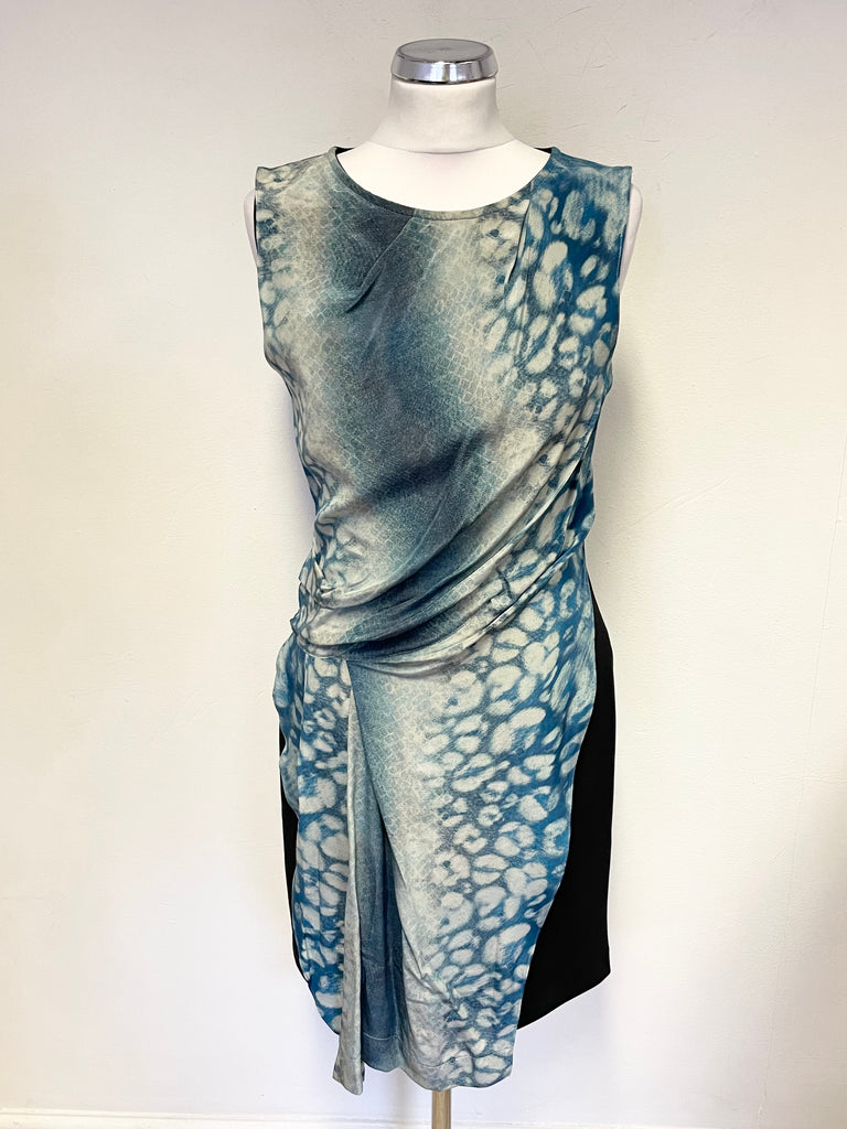 ALL SAINTS SERPENT BLACK & TURQUOISE BLUE SILK PANEL SLEEVELESS PENCIL DRESS SIZE 12