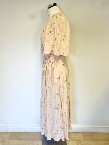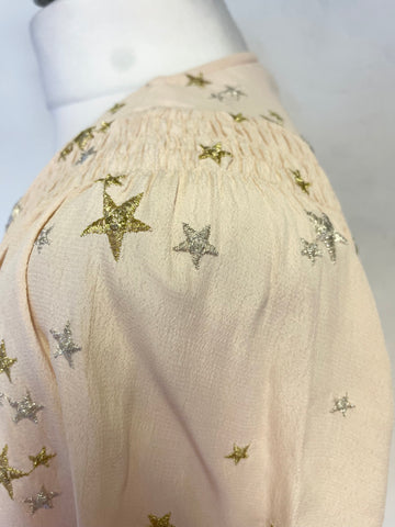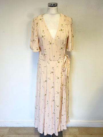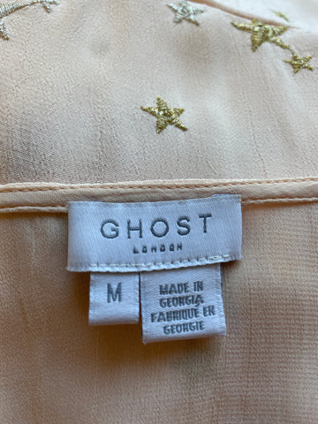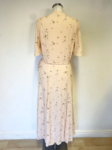 BRAND NEW GHOST PALE PEACH SILVER & GOLD STAR EMBROIDERED SHORT SLEEVED MIDI WRAP DRESS SIZE M