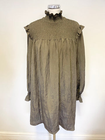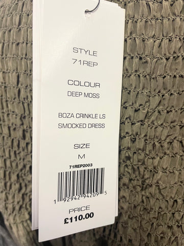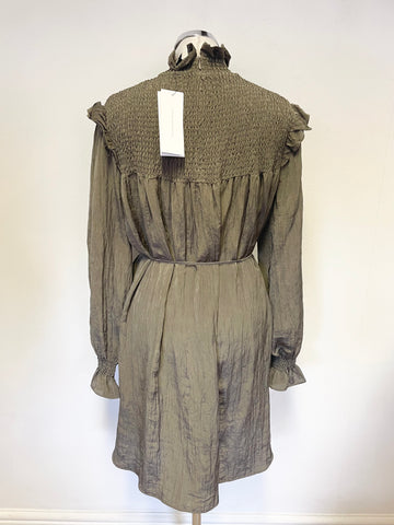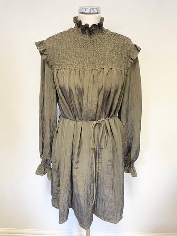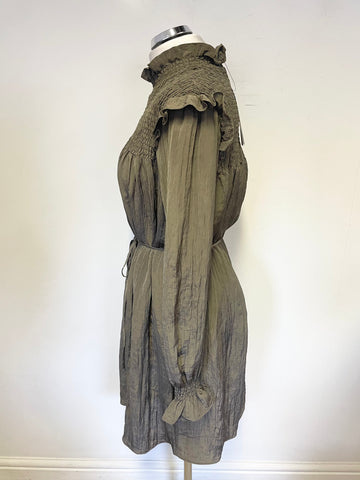 BRAND NEW FRENCH CONNECTION DEEP MOSS CRINKLE LONG SLEEVE BELTED SMOCK DRESS SIZE M