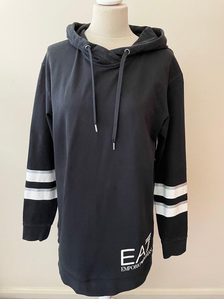 EMPORIO ARMANI BLACK,GREY & WHITE STRIPE TRIMMED LONG SLEEVE HOODED SWEATSHIRT SIZE M
