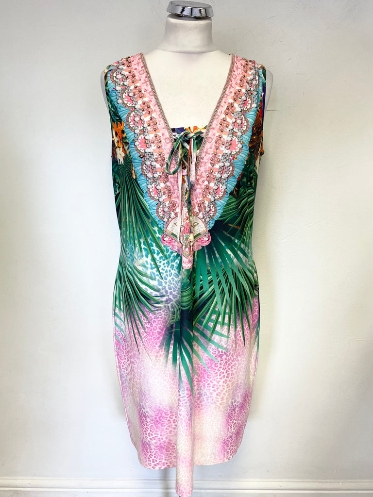 K DESIGN GREEN & PINK PRINT BEAD & SEQUINNED LACE UP SLEEVELESS SHIFT DRESS