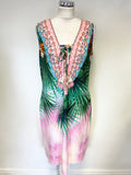 K DESIGN GREEN & PINK PRINT BEAD & SEQUIN TRIM LACE UP SLEEVELESS SHIFT DRESS SIZE XL