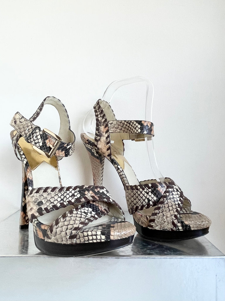 MICHAEL KORS JETSET 6 BEIGE & BROWN SNAKESKIN PRINT PLATFORM & HIGH HEEL SANDALS SIZE 6/39