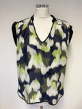 WHISTLES BLUE,IVORY & GREEN PRINT SLEEVELESS 100% SILK TOP SIZE 8