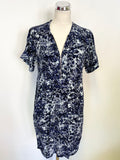 WHISTLES NAVY BLUE PATTERNED V NECK ZIP FRONT SHORT SLEEVE SHIFT DRESS SIZE 8