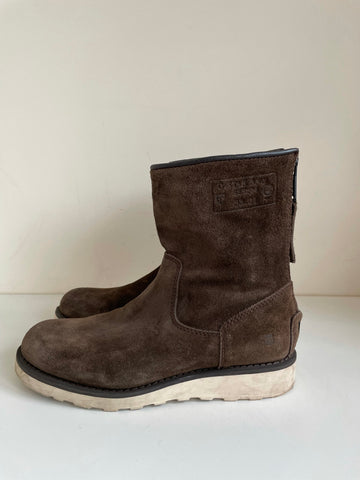 Refined details - the belt, which feeds through a loop at the back of the boot, is made from oiled leather and features a metallic buckle with an embossed Emu logo. The boot is designed with an asymmetric opening that has a raw edge, allowing the soft genuine sheepskin to show.