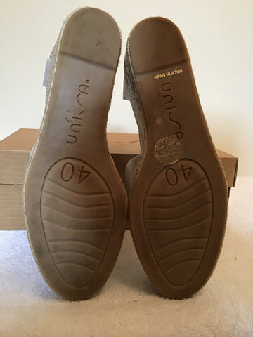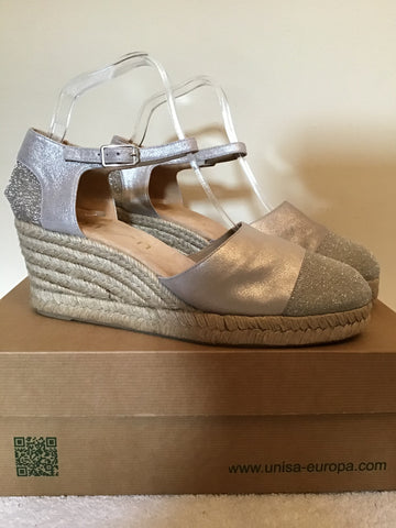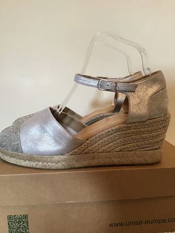 BRAND NEW UNISA SILVER LEATHER & GLITTER TRIM WEDGE HEEL SANDALS SIZE 7/40