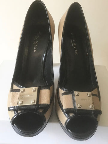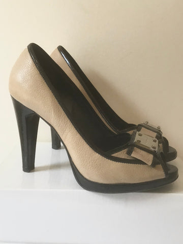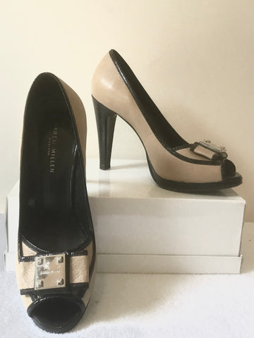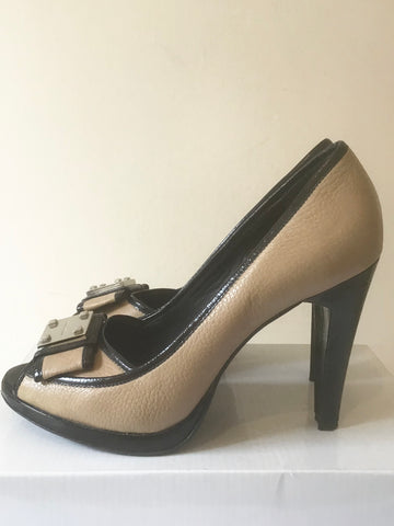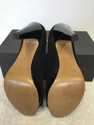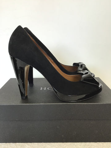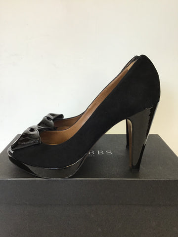 HOBBS FELIX BLACK SUEDE & PATENT LEATHER BOW TRIM PEEP TOE HEELS SIZE 7/40