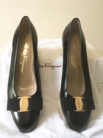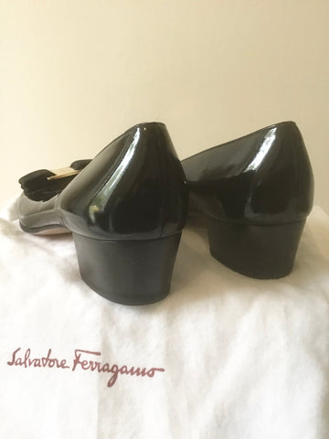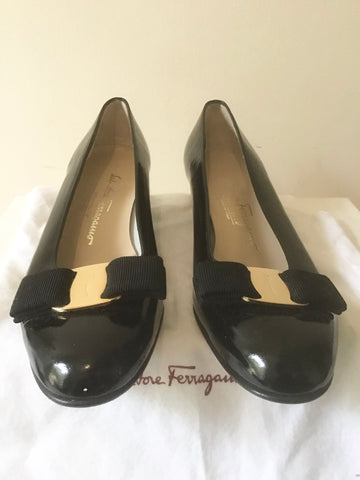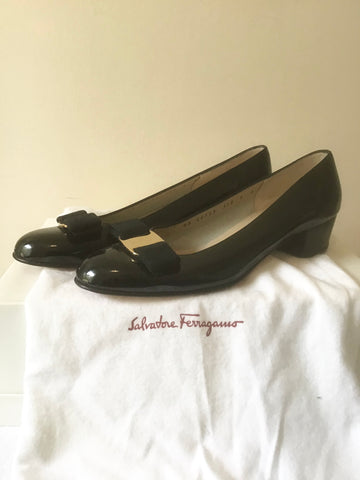 BRAND NEW SALVATORE FERRAGAMO BLACK PATENT LEATHER BOW TRIM COURT SHOES SIZE 2/35