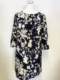 BODEN BLUE,BLACK & WHITE LEAF PRINT 3/4 SLEEVE SHIFT DRESS SIZE 12R