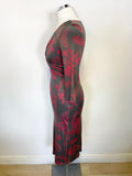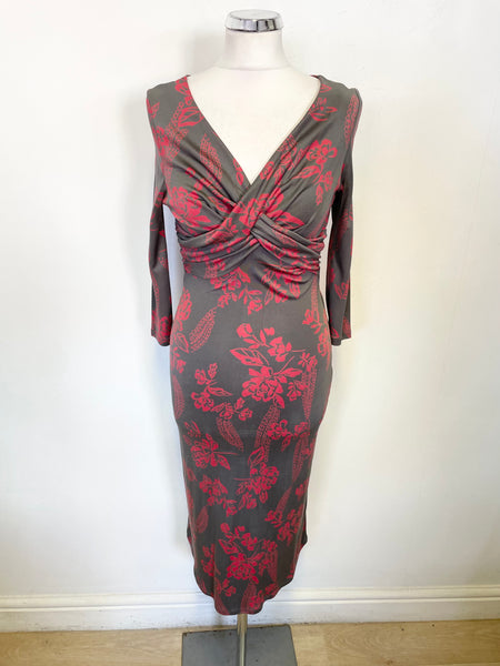COAST 100% SILK GREY & RED FLORAL PRINT V NECK 3/4 SLEEVE PENCIL DRESS SIZE 8