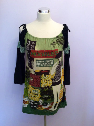 Custo Black & Green Print Wide Neck Top Size 2 UK 10/12