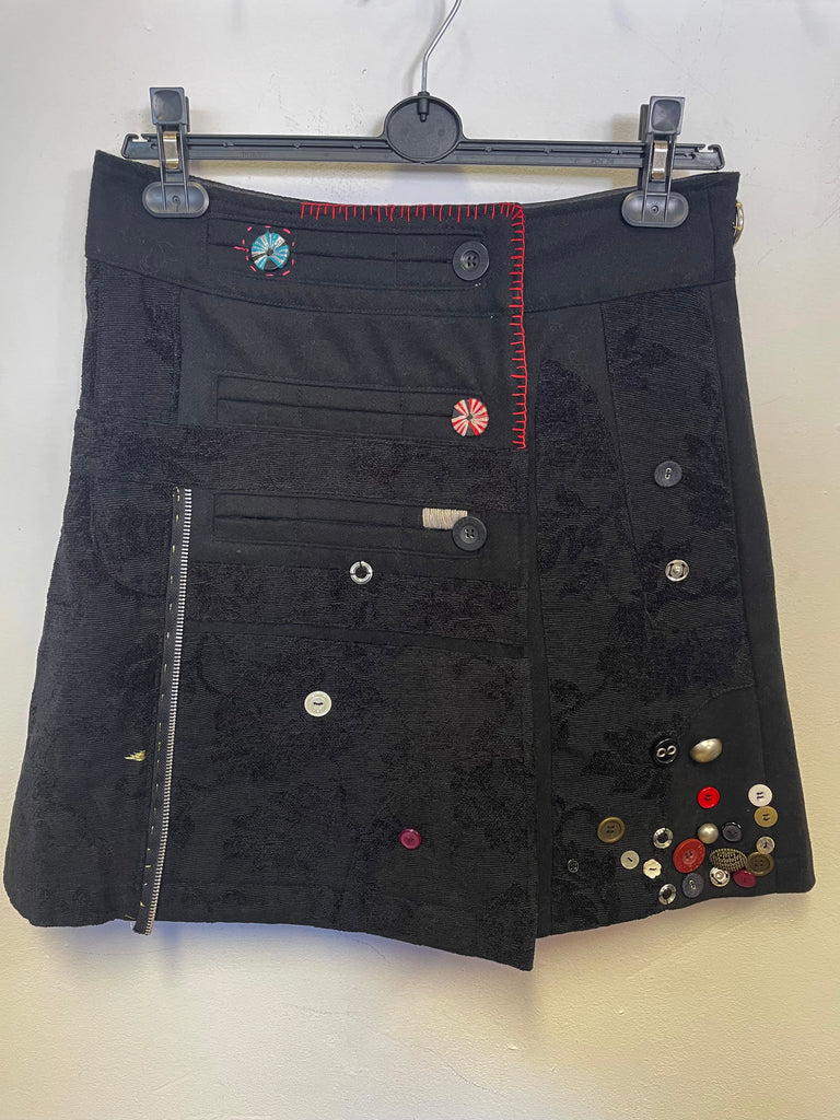 DESIGUAL BLACK BUTTON & EMBROIDERY EMBELLISHED WRAP SKIRT SIZE 36 UK 8