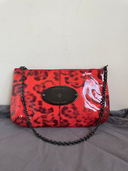 NEW MULBERRY ORANGE ANIMAL PRINT PATENT LEATHER SMALL CLUTCH BAG WITH CHAIN STRAP