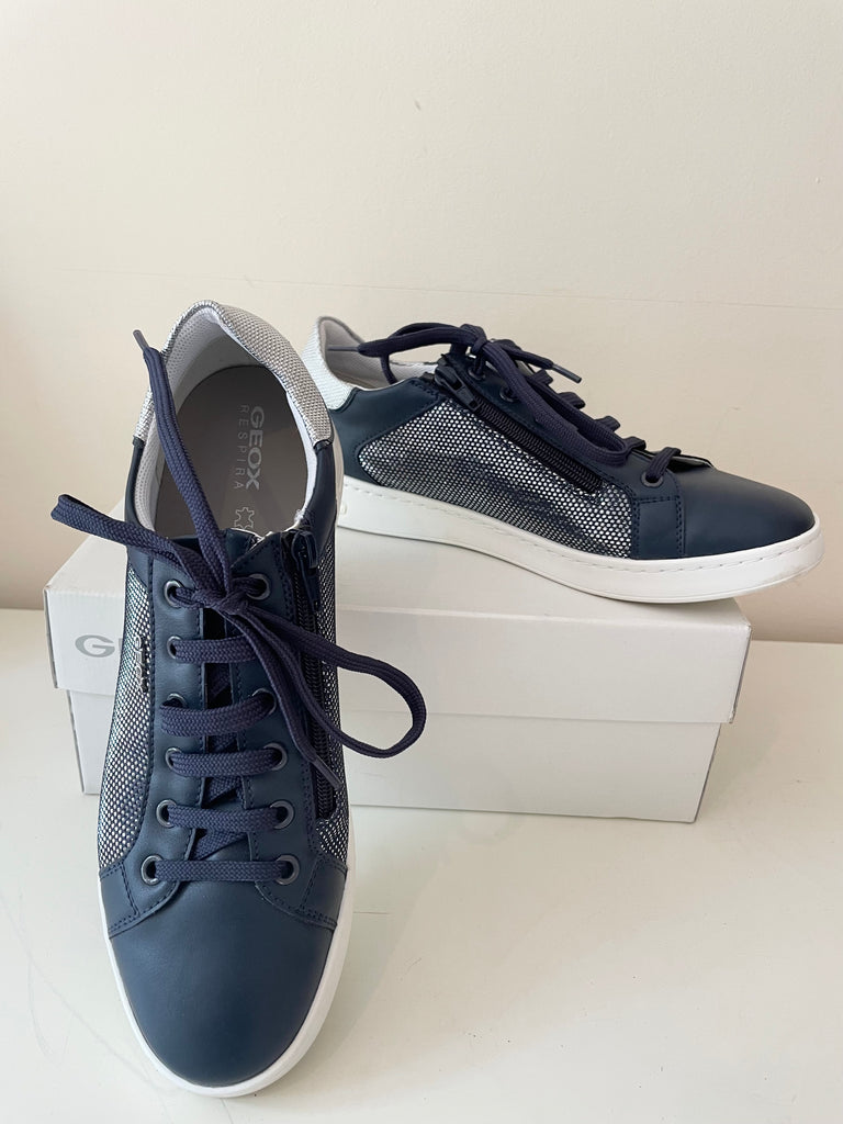 BRAND NEW GEOX NAVY BLUE & SILVER LEATHER TRAINERS SIZE 6/39