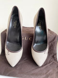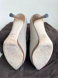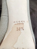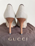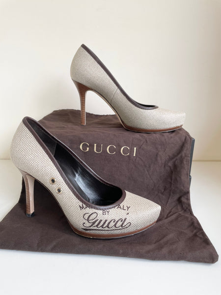 GUCCI BEIGE TEXTILE & BROWN LEATHER TRIM HEELS