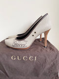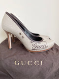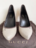 GUCCI BEIGE TEXTILE & BROWN LEATHER TRIM LOGO PRINT HEELS SIZE 3.5/36.5