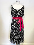 HOBBS BLACK & IVORY SPOT & RED SASH BELT SLEEVELESS SILK FIT & FLARE DRESS SIZE 12