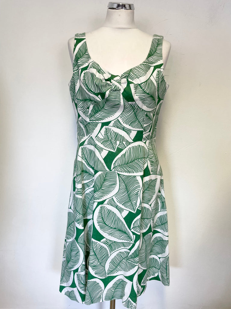 HOBBS GREEN & WHITE LEAF PRINT LINEN SLEEVELESS A LINE DRESS SIZE 12