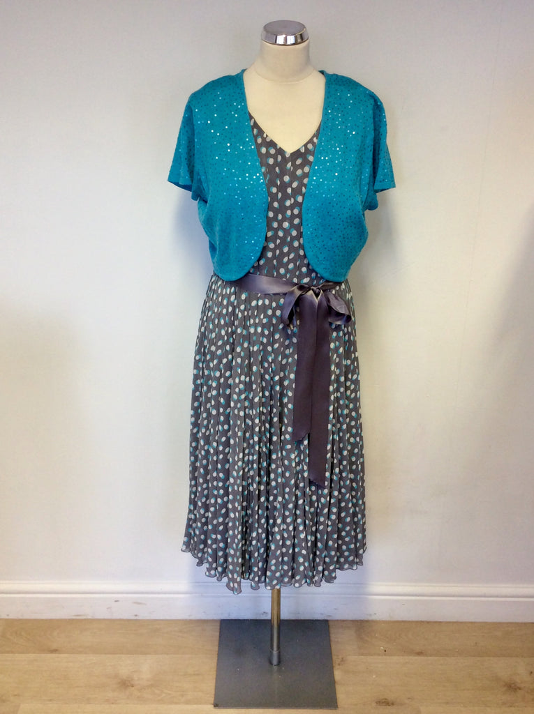 JACQUES VERT TURQOUISE & GREY PRINT OCCASION DRESS & BOLERO CARDIGAN SIZE 16