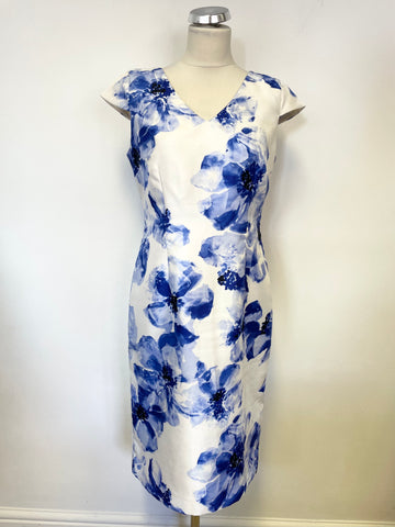 JACQUES VERT BLUE FLORAL LACE OVER SILVER SATIN LINING SLEEVELESS PENCIL DRESS