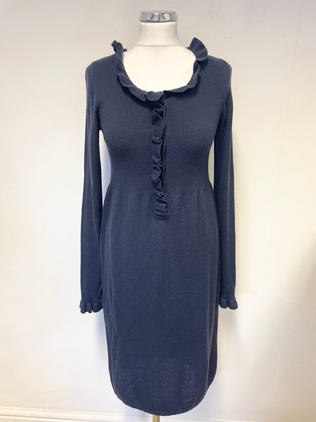 JIGSAW BLUE FRILL TRIM WOOL BLEND LONG SLEEVED KNIT DRESS SIZE M