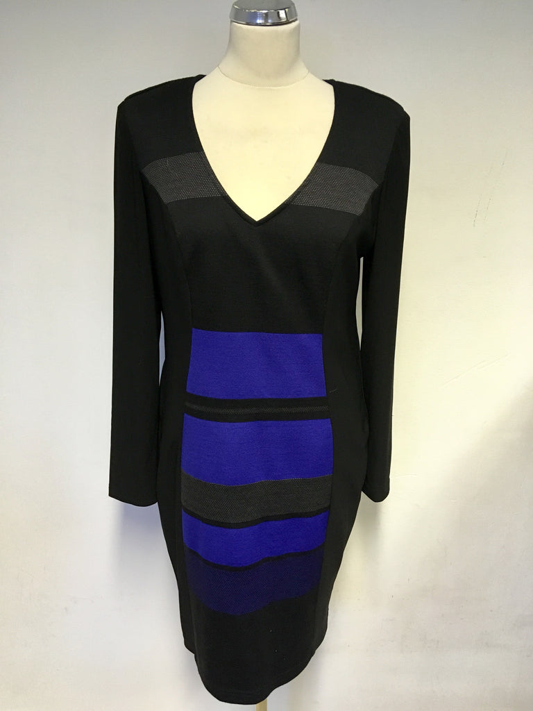 JOSEPH RIBKOFF BLACK,GREY & BLUE LONG SLEEVE PENCIL DRESS SIZE 16