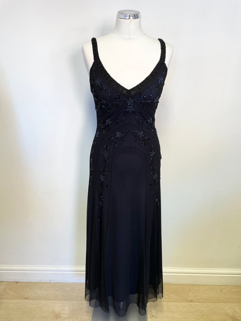 KALIKO NAVY BLUE MESH OVERLAY BEADED SLEEVELESS EVENING DRESS SIZE 10