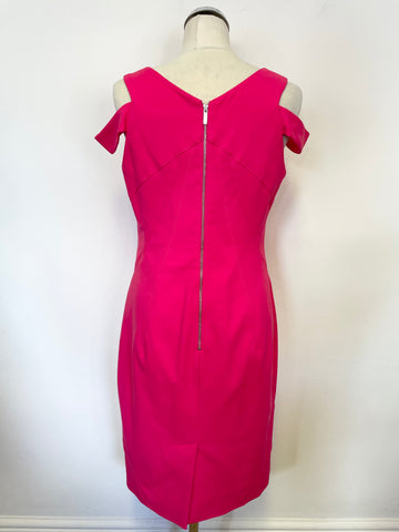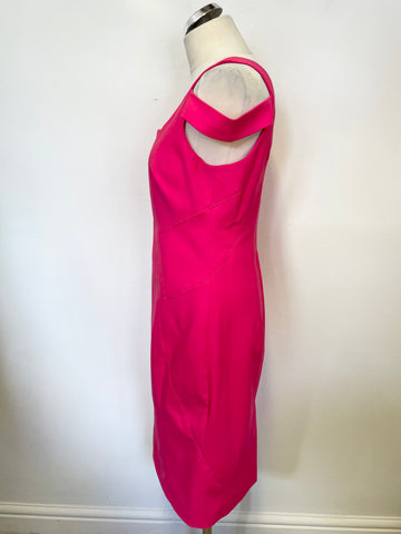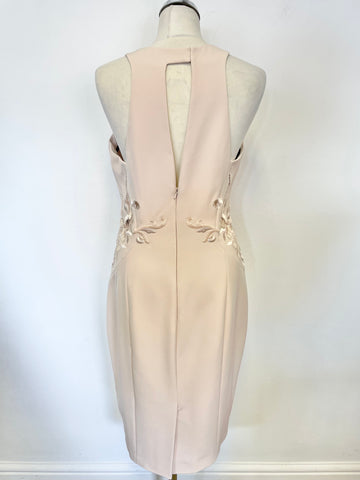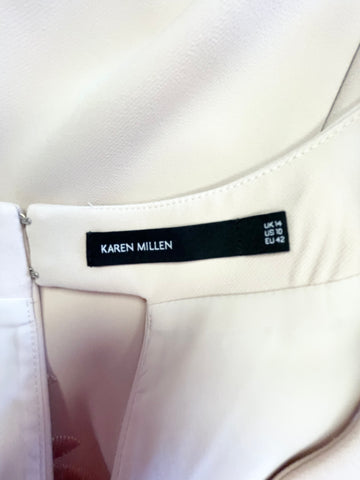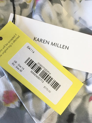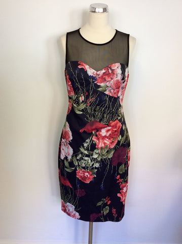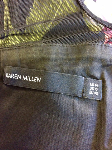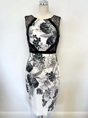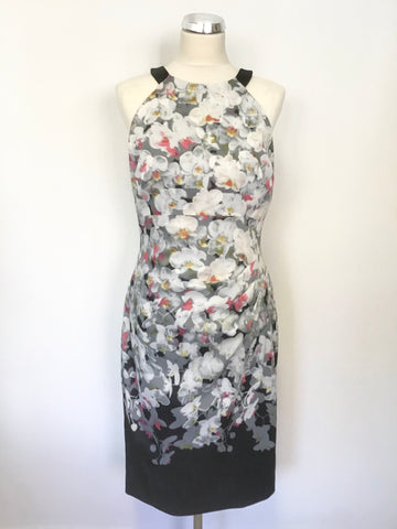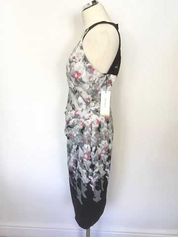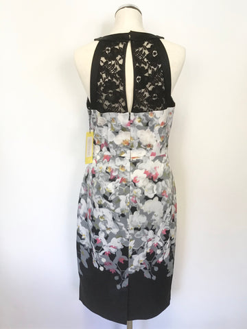 BRAND NEW KAREN MILLEN BLACK,GREY,WHITE & PINK FLORAL PRINT LACE BACK PENCIL DRESS SIZE 14