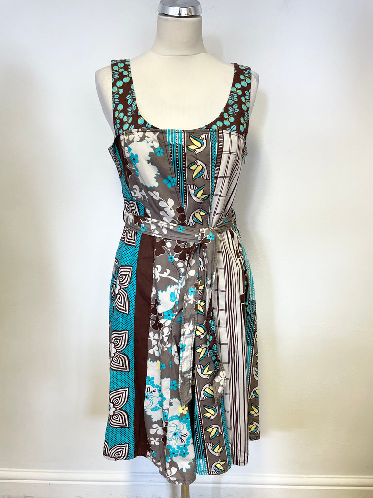 KENZO BROWN & TURQUOISE PRINT SLEEVELESS COTTON FIT & FLARE DRESS SIZE 42 UK 12
