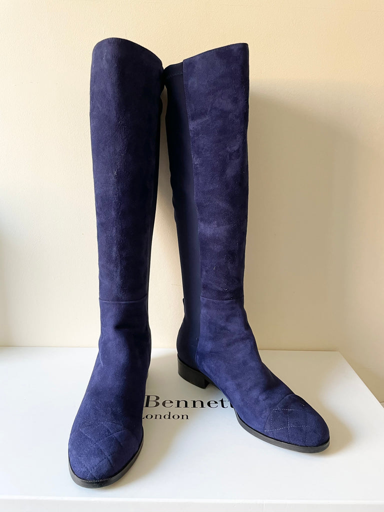 LK BENNETT BAMBRA DENIM BLUE SUEDE ELASTICATED PANEL KNEE LENGTH BOOTS SIZE 5/38