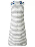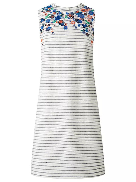 LK BENNETT BEA BLUE & WHITE STRIPED WITH FLORAL EMBROIDERY SLEEVELESS SHIFT DRESS