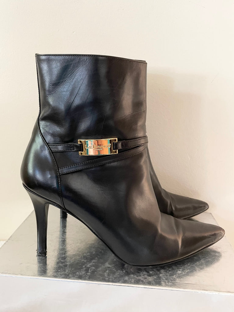 LK BENNETT BLACK LEATHER WITH GOLD PLATE TRIM STILETTO HEEL ANKLE BOOTS SIZE 6/39