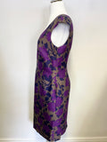 LK BENNETT BROWN, NAVY & PURPLE PRINT SLEEVELESS WOOL & SILK PENCIL DRESS SIZE 14
