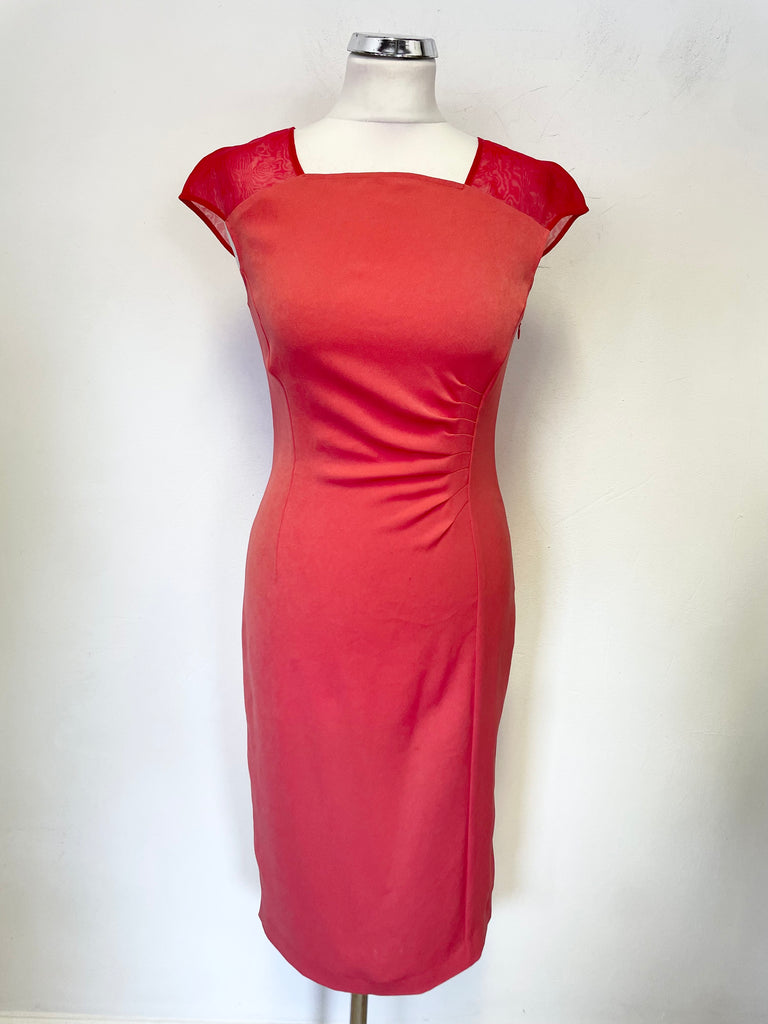 LK BENNETT CORAL & RED MESH SHOULDER CAP SLEEVE PENCIL DRESS SIZE 8