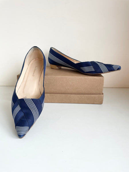 LK BENNETT NAVY BLUE & WHITE TEXTILE FLATS