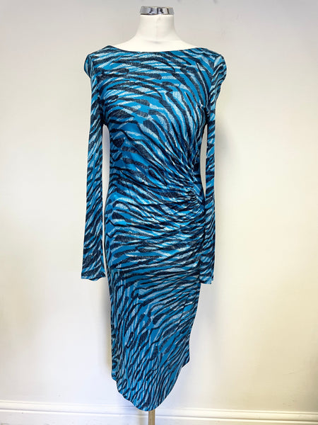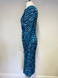 LK BENNETT TURQUOISE PRINT LONG SLEEVE STRETCH FITTED DRESS SIZE 16