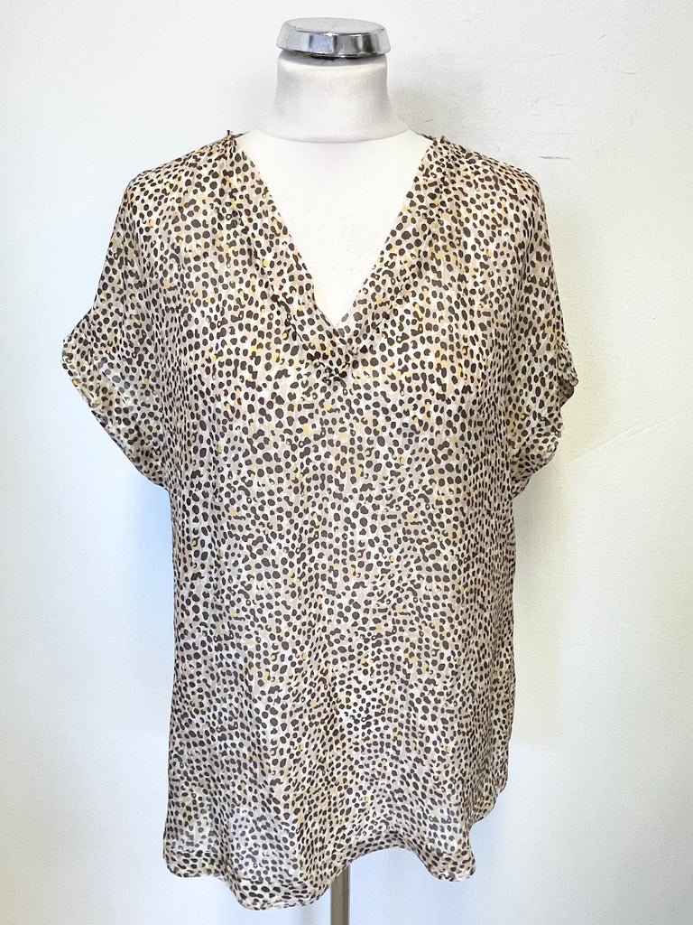 MARCCAIN 100% SILK BROWN, CREAM & MUSTARD PRINT SHORT SLEEVE TOP