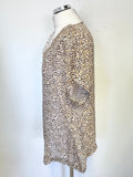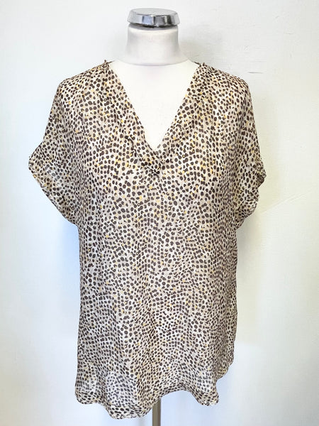 MARCCAIN 100% SILK BROWN, CREAM & MUSTARD PRINT SHORT SLEEVE TOP SIZE 5 UK 16