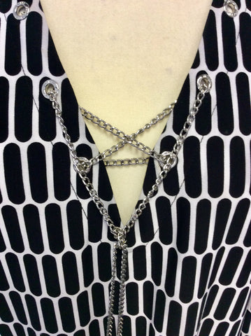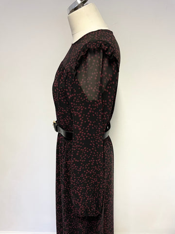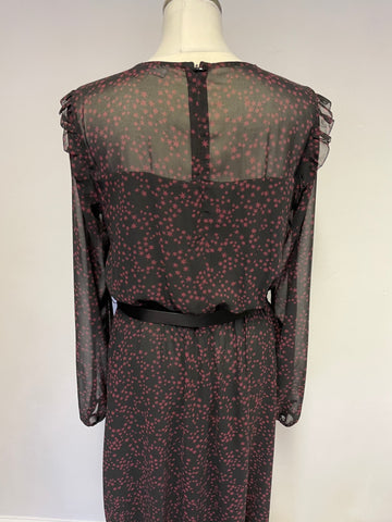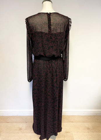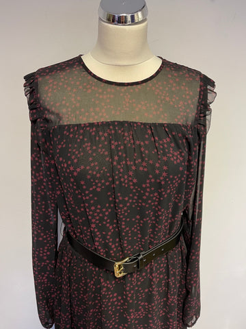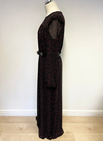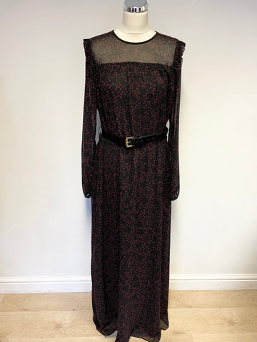 MICHAEL KORS BLACK & BURGUNDY STAR PRINTED BELTED CHIFFON MAXI DRESS SIZE L