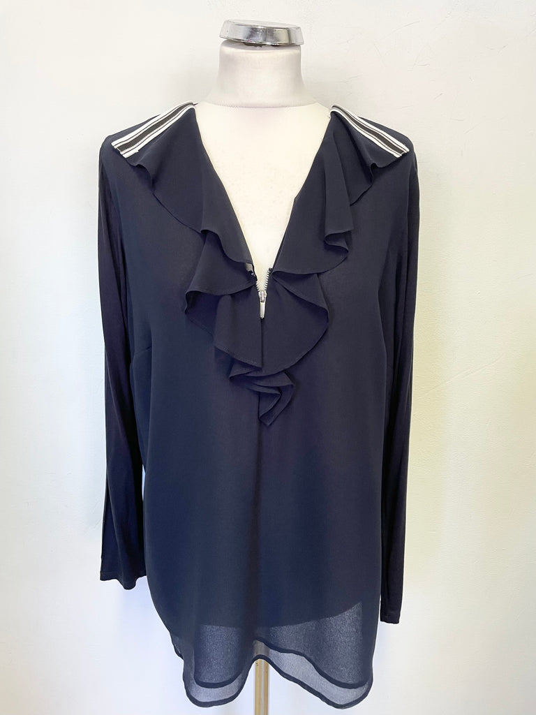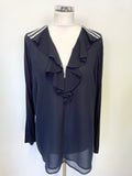 MINT VELVET NAVY BLUE FRILLED & ZIPPED FRONT LONG SLEEVED BLOUSE SIZE 14