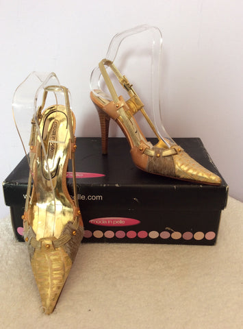 Brand New Moda In Pelle Gold Gated Slingback Heels With Studs