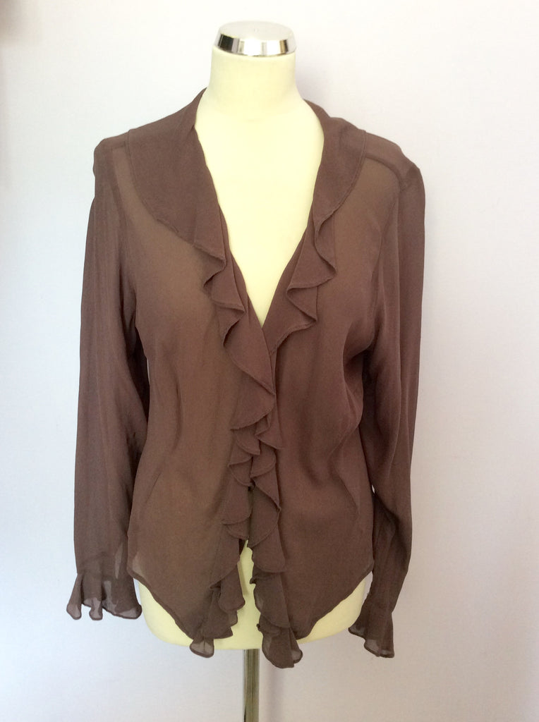 MONSOON BROWN SILK FRILL TRIM LONG SLEEVE BLOUSE SIZE 16