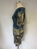 NINE WEST TURQOUISE,BLACK,CREAM & BROWN PRINT SHORT SLEEVE STRETCH DRESS SIZE 2 UK 10