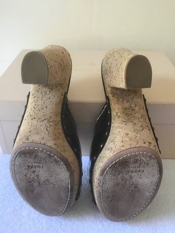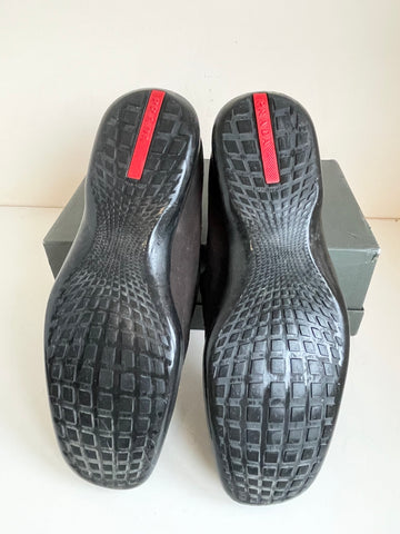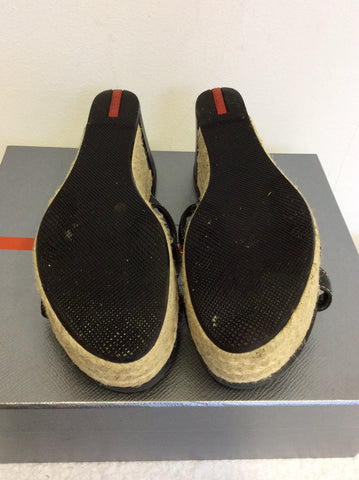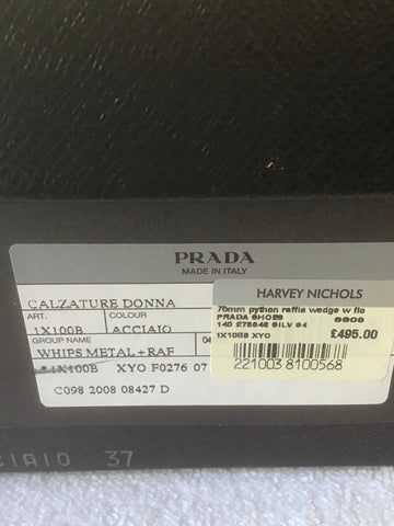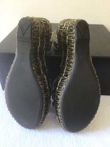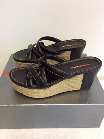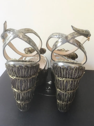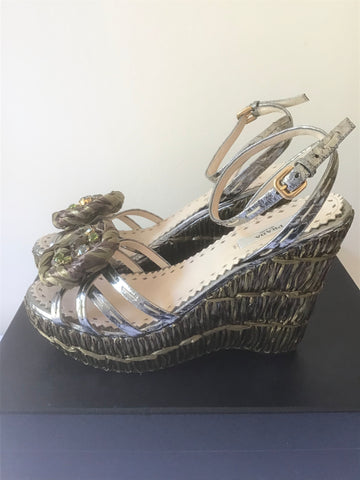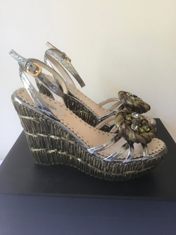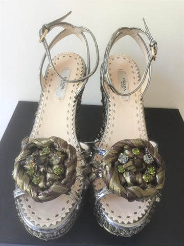 BRAND NEW PRADA PEWTER & BROWN RAFFIA WEDGE HEEL ANKLE STRAP SANDALS SIZE 4/37