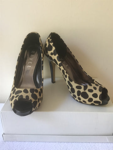 RAVEL BEIGE & BLACK PONY SKIN LEOPARD PRINT PEEPTOE HEELS SIZE 6/39