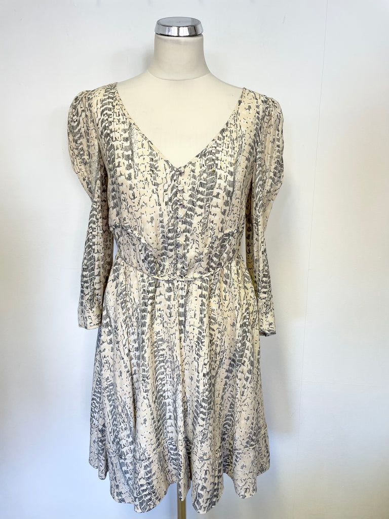 REISS JULIETTE CREAM & GREY FEATHER PRINT 3/4 SLEEVE DRESS SIZE 8
