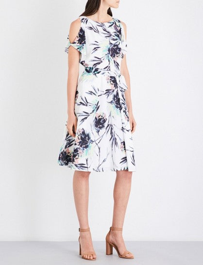 REISS NAOMI MULTICOLOURED PRINT COLD SHOULDER FIT & FLARE DRESS